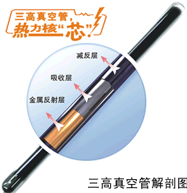 三高真空管:高效集熱、耐高溫、抗高寒,開創(chuàng)了太陽能集熱應(yīng)用的嶄新時代。它采用國際領(lǐng)先的納米干涉膜技術(shù),解決了傳統(tǒng)的漸變型選擇吸收鍍膜的反射曲線不陡峭,發(fā)射比隨溫度升高顯著增大從而降低集熱效率的不足;并且采用了低發(fā)射比的金屬底層,集熱性更好,并在膜層中濺射耐高溫金屬,提高了膜層的耐高溫能力。